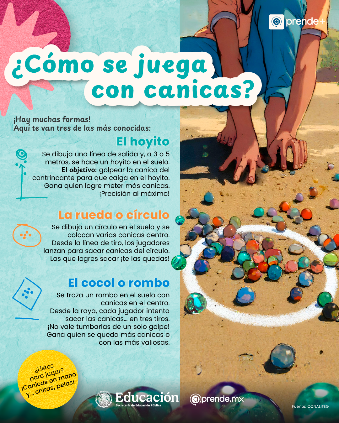 primaria- Existen tres formas principales de jugar con canicas: 'El hoyito', 'La rueda o círculo' y 'El cocol o rombo', cada una con reglas específicas.