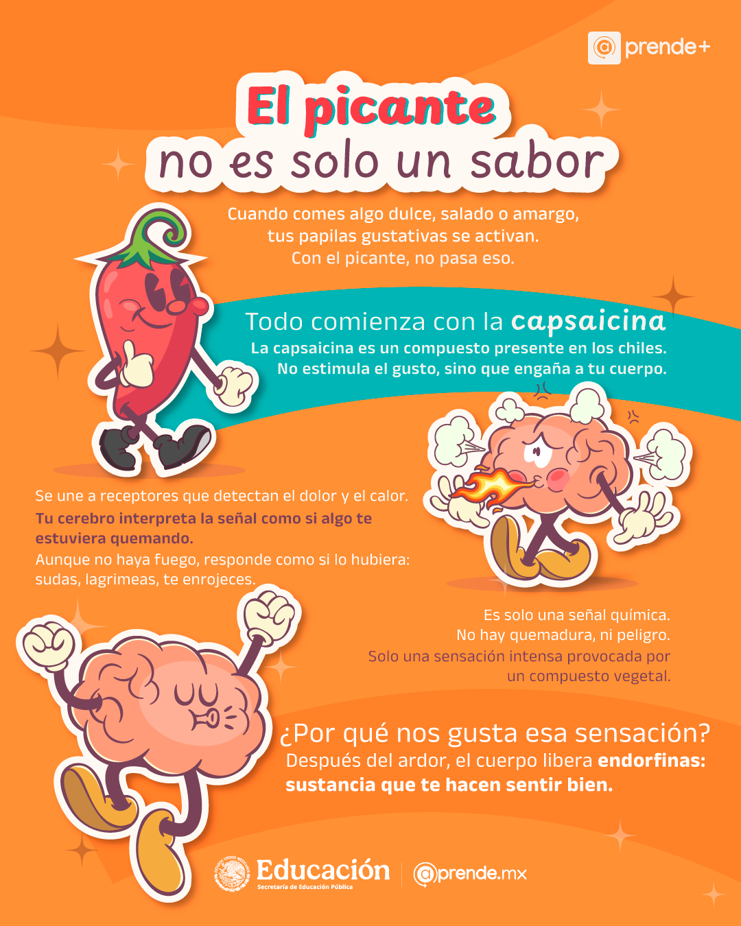 - El diseño educativo utiliza colores llamativos y caricaturas para explicar de forma clara y atractiva cómo funciona la percepción sensorial del picante.